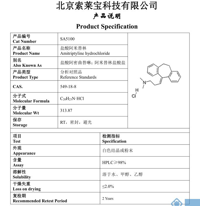 产品名称: Amitriptyline hydrochloride;盐酸阿米替林