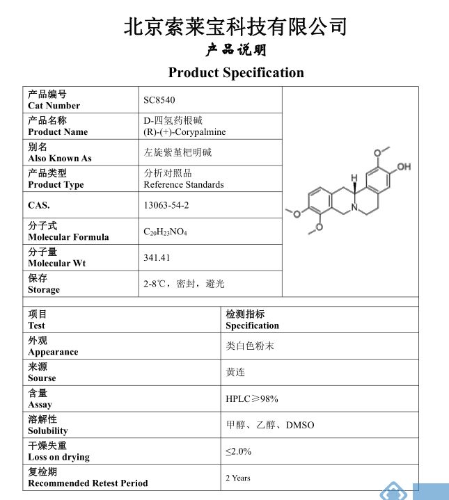 (R)-(+)-Corypalmine;D-四氢药根碱